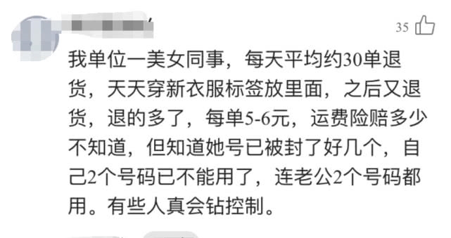 这样久而久之,退的太多了,不仅每单运费险能赚个2-3块,还能天天穿新衣服,但是这样操作久了,她的号已经被封了好几个了,听说她老公的两个号也被她拿来这样使用,也被封了,现在到处去找同事借淘宝号买东西,大家都不愿意借给她。